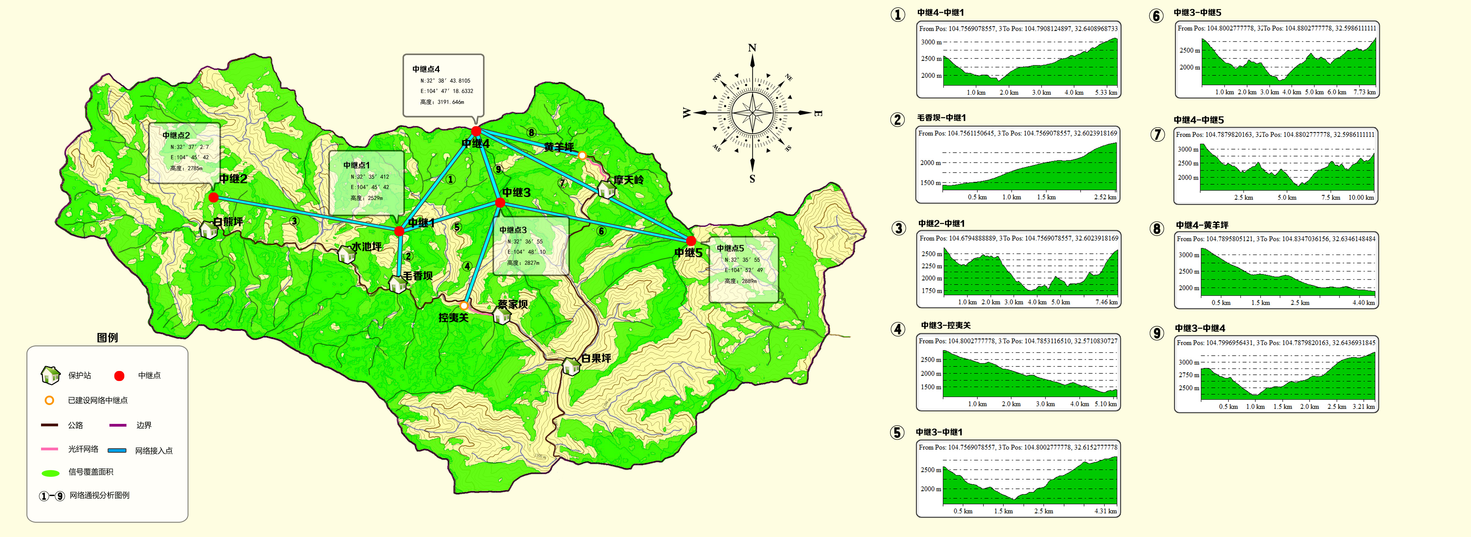 根據(jù)圖上等高線的標(biāo)示,該處區(qū)域?yàn)榕璧兀ㄗh中繼架設(shè)位置如下圖,采用數(shù)字中繼BF-R1000及數(shù)字對(duì)講機(jī)BF-P118或BF-P108配合使用。為保護(hù)區(qū)的日常管理工作提供通訊保障。