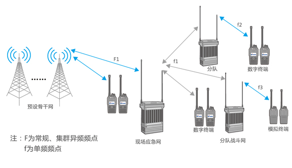 雙頻雙模技術(shù)是對(duì)超短波無(wú)線通信網(wǎng)進(jìn)行縱向延伸,從根本上解決了骨干網(wǎng)覆蓋率低、盲區(qū)多,保證超短波網(wǎng)實(shí)現(xiàn)覆蓋區(qū)“100%覆蓋”。其技術(shù)實(shí)現(xiàn)跨段中繼,結(jié)合同頻中繼技術(shù)實(shí)現(xiàn)對(duì)上通信及本級(jí)內(nèi)部通信需求。